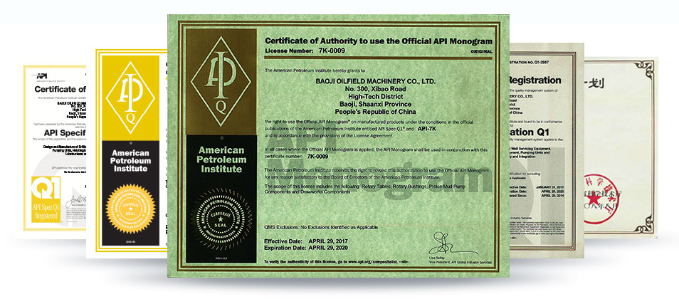 Under the instructions of ISO 9001 and API Spec Q1, BOMCO has established a complete quality control system. In 1995, BOMCO was awarded the ISO 9001:1994 certificate of quality system by DNV. In 1998, BOMCO became the first Chinese company which was awarded both ISO 9001:1994 and API certificate of quality system. In 2001, BOMCO was awarded the ISO 9001:2000 certificate of quality system. In 1982, BOMCO became the first Chinese company which was awarded API monogram certificates. Up to now, as a company with the most API certificate.